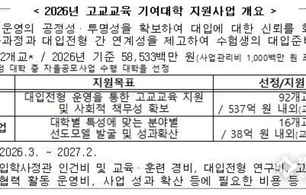 [대한민국교육신문] 교육부(장관 최교진)와 한국대학교육협의회는 2월 11일, ‘2026년 대학의 장애학생지원센터 운영지원 사업’을 공고하고, 장애대학(원)생의 대학 생활 및 학습에 필요한 인력과 기기 등을 본격 지원한다. ‘대학의 장애학생지원센터 운영지원 사업’은 장애대학(원)생의 대학 생활과 학습에 필요한 지원 인력, 보조기기 및 장애인식개선교육 등에 소요되는 경비를 지원하는 사업이다. 세부적으로 첫째, 이동·대필 등을 지원하는 일반 교육지원인력과 속기사·수어통역사 등 전문 교육지원인력을 지원한다. 둘째, 점자정보단말기 등 학습에 필요한 보조공학기기를 지원한다. 셋째, 장애대학(원)생의 교육환경 개선을 위해 대학이 현장 여건에 맞게 제안하는 사업과 장애인식개선교육을 지원한다. 참여를 희망하는 대학은 장애학생의 수요를 파악한 뒤 장애인고등교육지원센터(대교협)에 2월 26일(목)부터 3월 12일(목)까지 신청하면 된다. 올해에는 장애대학(원)생의 학습권 보장을 강화하기 위해 현장 수요가 많은 일반 및 전문 교육지원인력을 전년도보다 10% 확대 지원한다.(’25년 16.5억 원 → ’26년 18.15억 원) 교육부와 대교협은 대학 담당자의 이해를 돕기 위해 2월