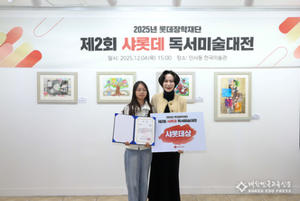 롯데장학재단(이사장 장혜선)은 지난 4일(목) 서울 종로구 인사동 한국미술관에서 <제2회 샤롯데 독서미술대전>의 시상식을 개최했다. 올해 2회째를 맞은 ‘샤롯데 독서미술대전’은 청년 시절 문학가의 꿈을 키웠던 롯데그룹 창업주 故 신격호 명예회장의 문학정신을 계승하고, 독서와 미술을 결합한 독후 미술활동을 통해 아동·청소년 내 독서문화를 확산하고자 마련된 공모전이다. 롯데장학재단은 지난 9월부터 약 두 달간 전국의 초등학생 고학년 및 중학생을 대상으로 응모작을 접수 받았다. 이후 독서 및 미술 전문가 5인으로 구성된 심사위원단이 △주제표현성 △창의성 △예술성 등을 기준으로 예심과 본심을 거쳐 총 50점의 수상작을 선정했다. 이날 시상식에서는 고헌중학교 1학년 김현서 학생이 대상 격인 ‘샤롯데상’의 영예를 안았다. 대상 수상자에게는 상장과 상금 200만원이 수여됐으며, 금상 3명(각 100만 원), 은상 6명(각 50만 원), 동상 10명(각 30만 원), 장려상 30명(각 20만 원)에게도 상장과 상금이 전달됐다. 수상작들은 이번 전시를 통해 함께 공개된다. 롯데장학재단 장혜선 이사장은 시상식에서 “독서미술대전은 책을 더 가까이서 즐기고, 읽은 내용