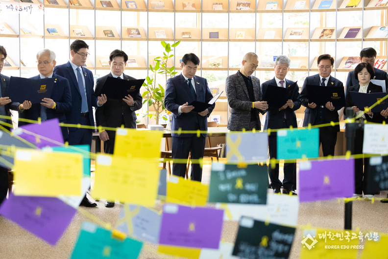 이어 ▲비판적 사고를 통해 스스로 삶을 설계하는 학생 중심 교육 ▲존중과 배려를 바탕으로 민주시민으로 성장하는 교육 ▲안전한 환경 조성을 위한 직무 책임 실천 ▲안전하고 행복한 사회를 위한 교육의 역할 등을 함께 다짐하고, 추모의 시간을 가졌다.
