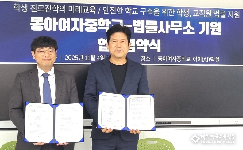 동아여중 오광섭 교장은 “이번 협약을 통해 학생과 교직원이 법적 문제로 어려움을 겪을 때 즉시 도움을 받을 수 있는 든든한 지원체계가 마련됐다”며 “법률사무소와 협력해 학생들의 권리 의식과 진로 역량이 함께 성장하는 학교 문화가 조성되도록 최선을 다하겠다”고 말했다.