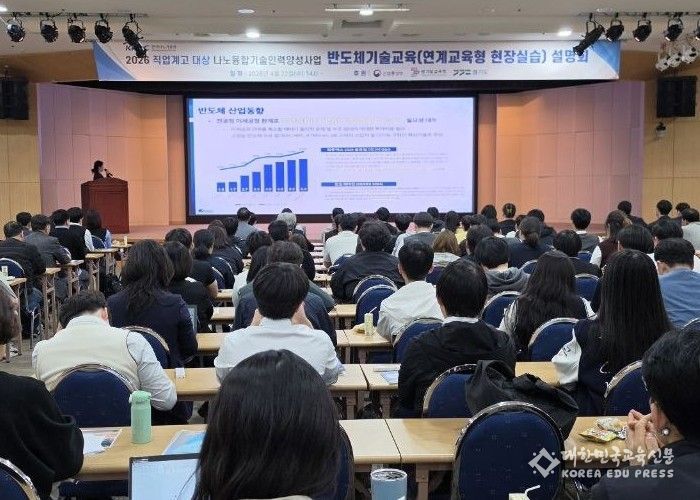 [대한민국교육신문] 경기도교육청이 22일 경기도경제과학진흥원에서 한국나노기술원과 함께 도내 직업계고 학생의 나노·반도체 분야 인재 육성을 위한 ‘2026 나노융합기술인력 양성사업 및 취업 지원’ 공동설명회를 개최했다.