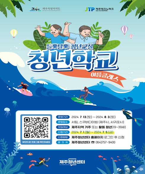 [대한민국교육신문] 제주특별자치도와 제주청년센터가 7월 1일 부터 7월 5일까지 제주청년학교 여름 특별 프로그램 참여자를 모집한다.