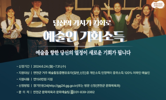 [대한민국교육신문] 연천군은 오는 7월 31일까지 경기도 예술인 기회소득 신청을 받는다고 밝혔다.