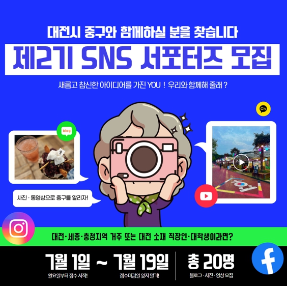 [대한민국교육신문] 대전 중구는 오는 7월 19일까지 중구 공식 소셜미디어에서 다양한 중구의 소식과 매력을 전할 제2기 중구 소셜미디어 서포터즈를 모집한다고 밝혔다.