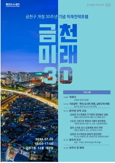 구는 내년에 개청 30주년을 맞이한다. 이에 금천의 과거와 성과들을 살펴보고, 미래 30년을 설계하기 위하여 전문가들의 의견을 들어보는 자리를 마련했다.