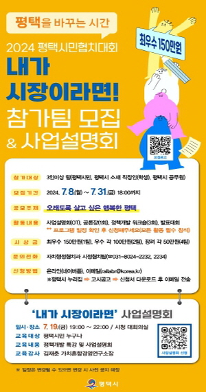 [대한민국교육신문] 평택시는 ‘오래도록 살고 싶은 행복한 평택시’를 만들기 위해 '2024 시민협치대회 ‘내가 시장이라면!’' 참가팀을 오는 7월 31일까지 모집한다고 밝혔다.