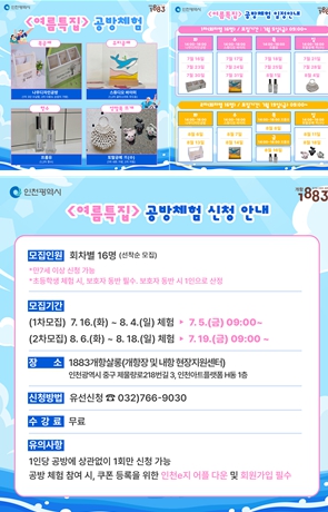 [대한민국교육신문] 인천광역시는 오는 16일부터 1883개항살롱(개항장 및 내항 현장지원센터)에서 ‘여름특집 공방체험’프로그램을 운영한다고 밝혔다.