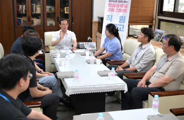 [대한민국교육신문] 음성군은 8일 집무실에서 ‘군수님과 함께하는 직원신문고’라는 제목으로 간담회를 열어 행정 최일선에서 근무하는 민원 담당 공무원들과 소통의 시간을 가졌다.