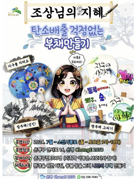 [대한민국교육신문] 은평구는 ‘은평 ChangE 2050 에너지카페’에서 냉방기 사용량이 급증하는 여름철을 맞아 일상 속 탄소배출을 줄일 방안으로 ‘탄소제로 나만의 부채 만들기’ 체험을 진행한다고 밝혔다.