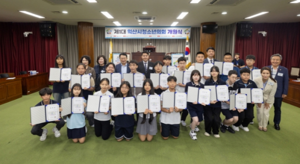 익산시는 9일 익산시의회 본회의장에서 '제1대 익산시 청소년의회 개원식'을 개최했다. 이날 개원식은 청소년 시의원 20명이 참석한 가운데 위촉장·배지 수여와 개원 선서, 의원 선서문 낭독 순으로 진행됐다.