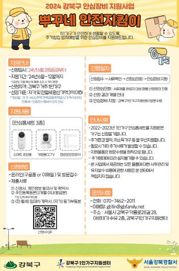 이순희 강북구청장은 "안심장비 지원사업이 1인가구의 범죄 불안감 해소에 도움이 되길 바란다"며 "앞으로도 안전취약계층을 위한 실효성 있는 지원을 통해 내 삶이 따뜻해지는 안심도시 강북을 만들어 나가겠다"고 말했다.
