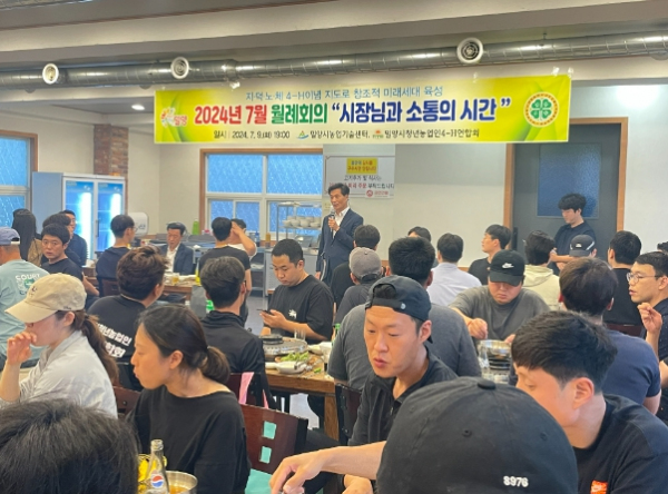 [대한민국교육신문] 안병구 밀양시장은 지난 9일 저녁 지역 내 식당에서 열린 밀양시청년농업인4-H회(회장 박도현) 7월 월례회행사에 참석해 청년 농업인 60여 명을 격려하고 소통하는 시간을 가졌다.