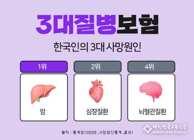 [대한민국교육신문] 3대질병으로 일컬어지는 암, 뇌혈관질환, 심혈관질환은 한국인의 주요 사망원인에서 상위를 차지하고 있으며, 이에 대한 진단비를 집중적으로 보장해 주는 보험상품을 3대질병진단비 보험이라 할 수 있다.