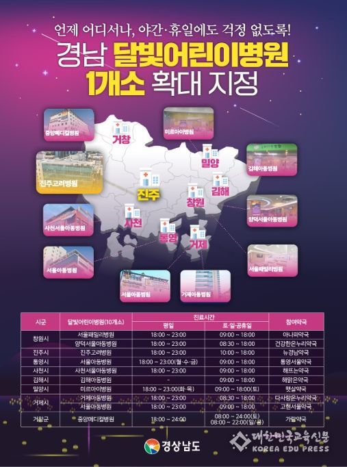 [대한민국교육신문] 경상남도는 소아 야간·휴일 진료 사각지대 해소를 위해 진주시에 ‘달빛어린이병원’을 신규 지정하고, 10월 20일부터 운영한다.