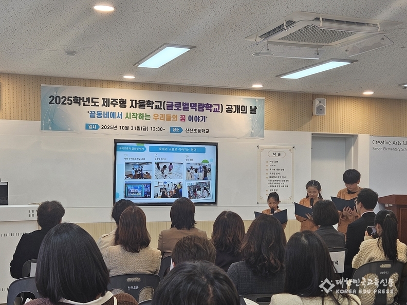 서귀포시 성산읍의 작은 학교 신산초등학교(교장 박진자)에서는, 아이들의 배움이 조용히 깊어지고 있다.아이들은 제주의 이야기를 배우고, 그 시선을 멀리 세계로 넓혀가며 ‘나’에서 ‘우리’로, ‘마을’에서 ‘세계’로 나아가는 길을 한 걸음씩 걷고 있다.