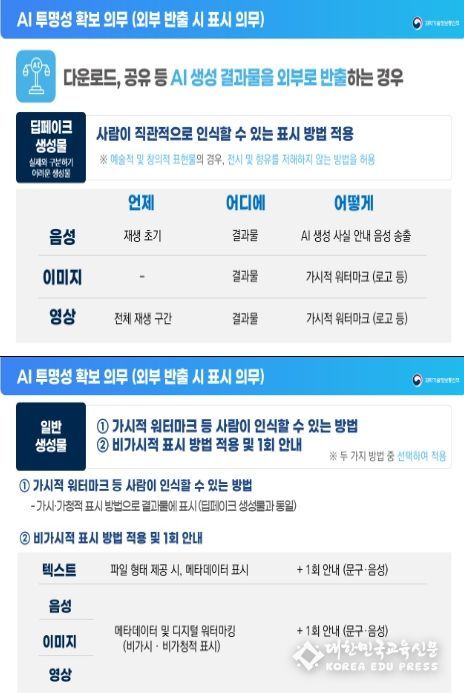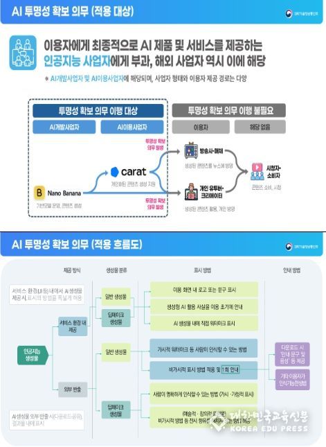 [대한민국교육신문] 과학기술정보통신부는 1월 22일'인공지능 발전과 신뢰 기반 조성 등에 관한 기본법' ‘인공지능 기본법’)상 투명성 확보 의무(제31조)의 구체적인 이행 방안을 담은'인공지능 투명성 확보 안내 지침(가이드라인)'을 공개했다.
