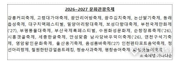 ‘2026~2027 문화관광축제’는 지난 2년간 전문가와 소비자, 지역주민 평가 결과와 바가지요금 등 부정적 문제 여부, 수용 태세 등을 종합적으로 고려해 선정했다.