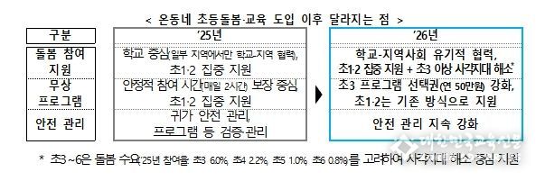 교육부는 2024년부터 늘봄학교 정책을 통해 초등학교 1‧2학년의 돌봄 공백 해소를 집중적으로 지원해 왔다. 2026년부터는 기존의 늘봄학교를 ‘온동네 초등돌봄‧교육’ 정책으로 발전시켜, ①학교와 지역사회가 함께 희망하는 초등학생에게 사각지대 없는 돌봄을 제공하고, ②돌봄보다 교육에 대한 수요가 큰 초등학교 3학년 이상 학생*의 방과후 교육 참여를 중점 지원한다.