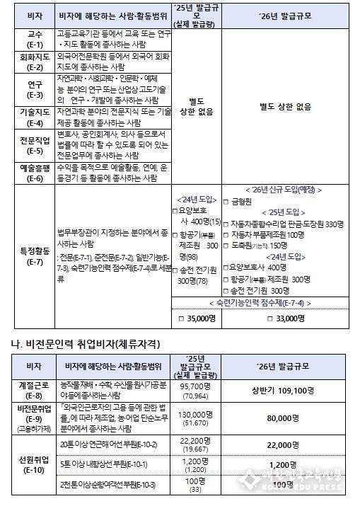 [대한민국교육신문] 법무부는 외국인 유입이 지역경제와 국민 일자리에 미치는 영향을 종합적으로 분석한 결과를 바탕으로, 관계부처와의 협의를 거쳐 2026년 연간 비자 발급규모를 공표했다.
