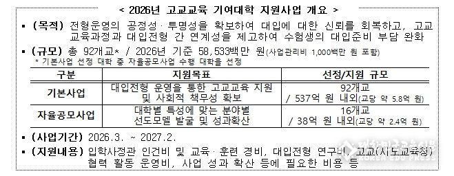 [대한민국교육신문] 교육부은 2월 24일, ‘2026년 고교교육 기여대학 지원사업 기본계획’을 발표한다.