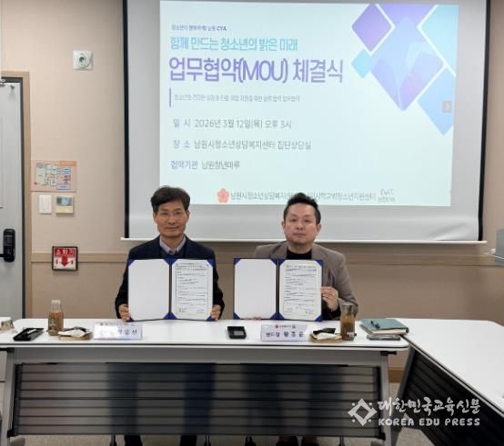 [대한민국교육신문] 남원시가 위탁하고 남원CYA가 운영하는 남원시학교밖청소년지원센터는 지난 12일 남원청년마루와 학교 밖 청소년의 건강한 성장과 자립 지원을 위한 업무협약(MOU)을 체결했다고 밝혔다.