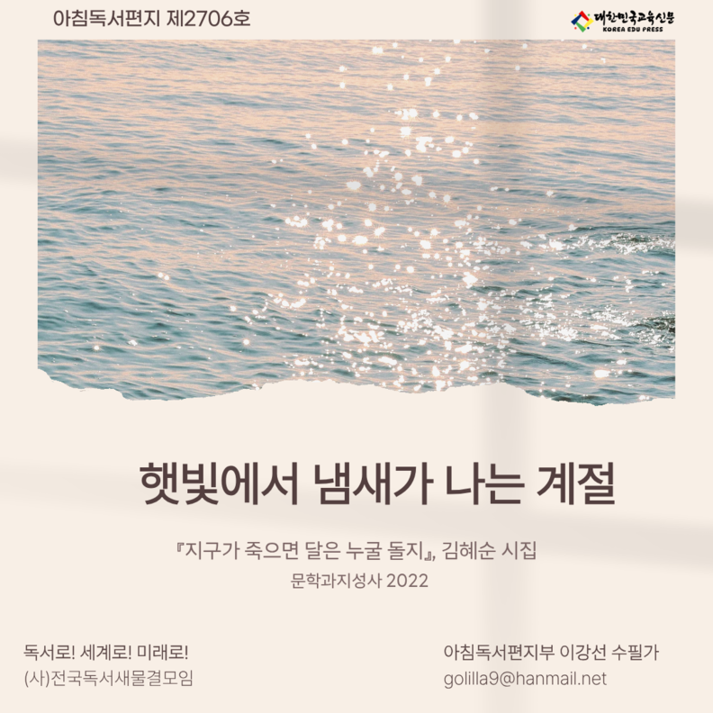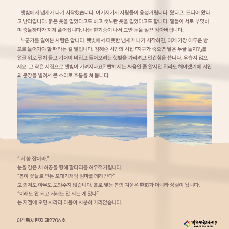 모두가 찬란한 봄의 서막을 노래할 때, 누군가는 그 눈부신 햇살 속에서 역설적으로 가장 깊은 그림자를 발견하곤 합니다. 오늘 아침독서편지는 햇빛에서 풍겨오는 낯선 냄새를 따라가며, 상실의 아픔을 외면하는 대신 김혜순 시인의 치열한 시어들로 그 슬픔을 오롯이 통과해보고자 합니다. 꽃이 피어나는 환희보다 더 절박한 마음으로 '봄을 붙잡아두려는' 한 수필가의 내밀한 고백을 통해, 우리 안의 환상통을 어루만지는 고요한 사유의 시간을 나누고 싶습니다. [편집자 주]