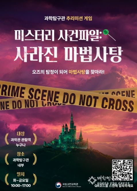 [대한민국교육신문] 과학기술정보통신부 국립과천과학관은 관람객이 즐길 수 있는 디지털 추리 임무(미션) 프로그램 『수수께끼(미스터리) 사건 파일: 사라진 마법 사탕』을 3월 31일부터 과학탐구관에서 선보인다고 밝혔다.