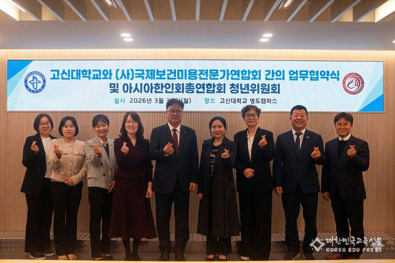 고신대학교는 2026년 3월 30일 영도캠퍼스에서 (사)국제보건미용전문가연합회 및 아시아한인회총연합회 청년위원회와 3자 간 업무협약(MOU)을 체결했다고 밝혔다.