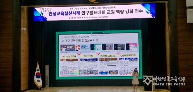 [대한민국교육신문] 대구시교육청은 지난 4월 10일, 시교육청 행복관에서 교원 및 기관 업무 담당자 100여 명을 대상으로 ‘2026학년도 인성교육실천사례 연구발표대회 교원역량강화 연수’를 개최했다.