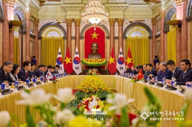 [대한민국교육신문] 베트남을 국빈 방문 중인 이재명 대통령은 22일(현지시간) 오후 베트남 국가주석궁에서 또 럼 당서기장 겸 국가주석과 정상회담을 갖고, 양국 간 포괄적 전략 동반자 관계 발전 방안과 지역·국제 정세 등에 대해 심도 있게 논의했다고 이규연 청와대 홍보소통수석이 서면 브리핑했다.