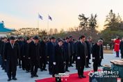 [대한민국교육신문] 이재명 대통령은 2026년 병오년 새해 첫날, 국립서울현충원 참배로 공식 일정을 시작했다. 참배식에는 김민석 국무총리 및 국무위원·장관들과, 강훈식 대통령비서실장을 비롯한 청와대 참모진이 함께했다. 먼저 이 대통령은 현충탑에 헌화·분향한 뒤 묵념하며 순국선열과 호국영령의 넋을 기렸다. 이어 방명록에 '“함께 사는 세상” 대한민국 대도약의 원년 대한국민과 함께 열겠습니다'라고 서명하면서 병오년 새해 의지를 담았다. 참배 이후 이 대통령은 청와대 직원식당에서 현충원 참배 참석자들과 떡국으로 조찬을 하며 덕담을 나눴다. 국립서울현충원 참배(이재명tv 유투브) [뉴스출처 : 청와대]