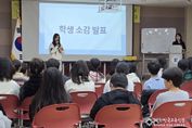 [대한민국교육신문] 충청북도교육청 직속기관 국제교육원 부설 영재교육원은 11월 3일과 4일, 충주와 청주에서 각각 영어영재교육 수료식을 열고, 2025학년도 교육과정을 성공적으로 마무리했다. 초등학교 5학년부터 중학교 2학년 영어영재교육 참여 학생 68명(충주 36명, 청주 32명)을 비롯해 보호자와 담당 교사가 참석해, 한 해 동안의 성과를 함께 나누는 시간을 가졌다. 교육활동 동영상 시청을 시작으로, 학생들의 수료 소감 발표, 수료증 수여 등의 순서로 진행됐으며, 학생 발표 시간에는 큰 호응이 이어졌다. 탄금중학교 1학년 이하율 학생은 “매주 원어민 선생님들과 영어로 학습할 수 있어 유익하고 즐거운 시간이었어요. 벌써 종강이라 아쉽고, 내년에도 꼭 참여하고 싶어요.”라며 소감을 전했다. 올해 영어영재교육은 ▲원어민 교사와 함께하는 영어 수업 ▲리더십‧진로‧세계시민교육 특강 ▲유네스코 아시아태평양 국제이해교육원, 국립외교원 방문 등 현장 체험 학습 ▲충북 청소년 국제포럼 등 다양한 경험을 할 수 있는 과정으로 운영됐다. 참가 학생들은 환경, 사회와 법, 문학, 뉴스와 대중매체, 인공지능 등 다양한 주제를 영어로 탐구하며 의사소통 능력, 고차원적 사고력, 글