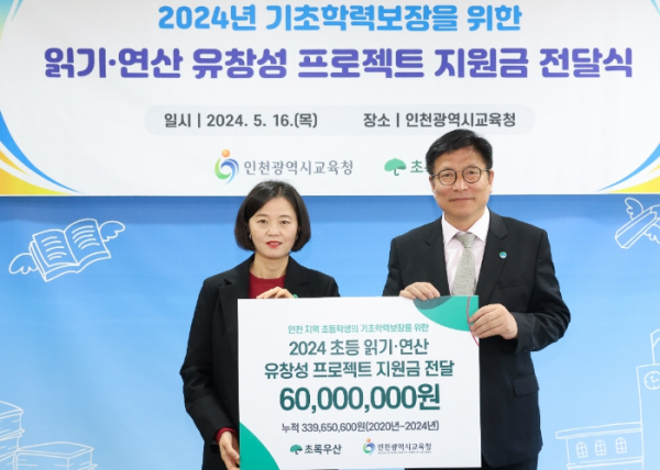 [대한민국교육신문] 인천광역시교육청은 초록우산 어린이재단 인천지역본부와 '2024 기초학력보장을 위한 읽기‧연산 유창성 프로젝트 지원금 전달식'을 16일 개최했다.