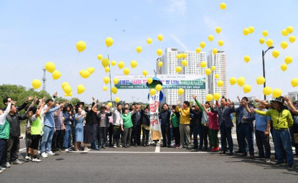 7일 삼례아리따운 아파트 주차장에서 열린 ‘사랑 드리미(米)’ 모내기 행사에는 유희태 완주군수와 서남용 완주군의회 의장을 비롯한 이장협의회 등 6개 단체 100여 명이 참석했다.
