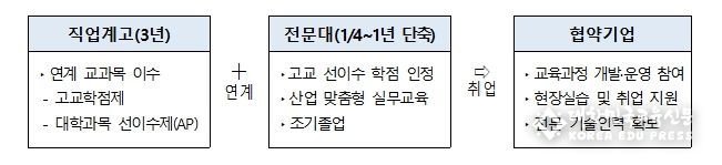 전문대학은 직업계고·기업과 함께 고교 및 대학의 전공과목을 분석해 교육과정의 연계성을 높인다. 예를 들어 전문대학에서 대학과목과 유사하다고 판단한 기존 고교과목에 대해서는 학점 이수를 인정하고, 학점으로 인정하기 위해 보완이 필요한 고교과목은 새롭게 구성하는 방식이다. 또한, 전문대학에서 직업계고 학생 맞춤형으로 대학과목 선이수(AP) 과목을 개설해 운영할 수도 있다.