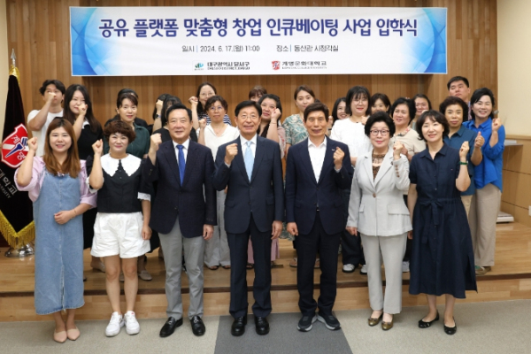 [대한민국교육신문] 대구 달서구가 17일 계명문화대학교 동산관에서 외식업 분야 창업에 관심 있는 20명의 예비창업자들과 함께‘공유 플랫폼 맞춤형 창업 인큐베이팅 사업’개강식을 개최했다.