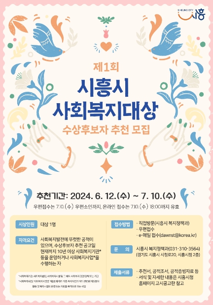 유재홍 시흥시 복지국장은 “다양한 사회복지 분야에서 두각을 나타낸 시민들의 공로를 인정하고, 그들의 노력과 기여를 널리 알릴 수 있도록 관심과 추천을 부탁드린다”라고 말했다.