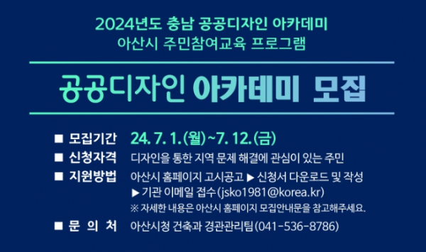 [대한민국교육신문] 아산시가 충남연구원 공공디자인센터에서 추진하는 ‘충청남도 공공디자인 아카데미’에 선정돼 1일부터 참여자를 모집한다.