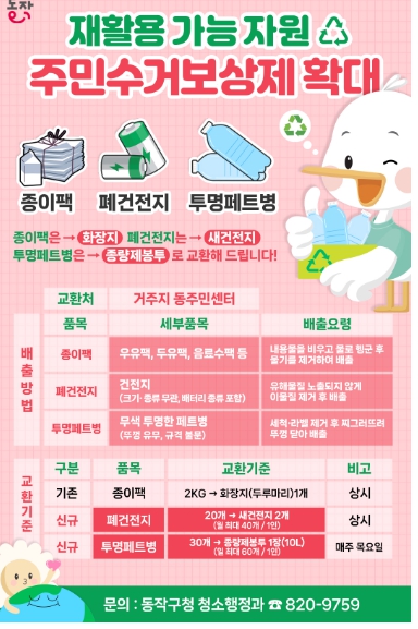 동작구에 거주하는 주민이면 누구나 참여 가능하며 교환을 원하는 경우 재활용품을 가지고 거주지 동주민센터를 방문하면 된다.