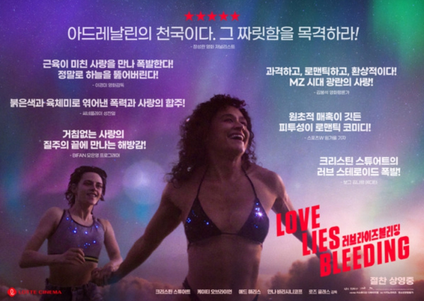 [대한민국교육신문] 폭발적인 미친 감성으로 국내 언론뿐 아니라 관객들의 마음까지 사로잡은 '러브 라이즈 블리딩'이 바로 오늘, 7월 10일(수) 개봉과 함께 리뷰 포스터를 공개했다.[원제: LOVE LIES BLEEDING ┃감독: 로즈 글래스┃출연: 크리스틴 스튜어트, 케이티 오브라이언, 에드 해리스, 데이브 프랑코, 안나 바리시니코프, 제나 말론 ┃수입/배급: ㈜스튜디오 디에이치엘┃제공: ㈜키노라이츠]