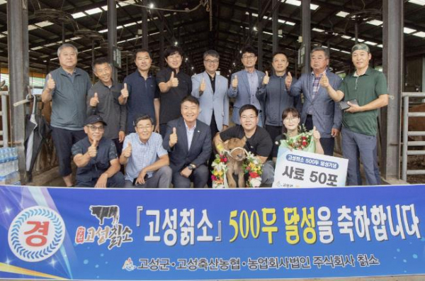 [대한민국교육신문] 고성군은 ‘고성 칡소’가 지난 6월 14일 전국 최초 “칡소 지리적표시 단체표장” 상표 등록에 이어 최근 500두 사육두수 달성에 따라 7월 18일 토성면 용촌1리 한우 농장에서 사육 농가, 고성 칡소 법인 및 고성 축협 등 관계자와 함께 꽃다발 및 사료(50포) 전달 등의 기념행사를 가졌다.
