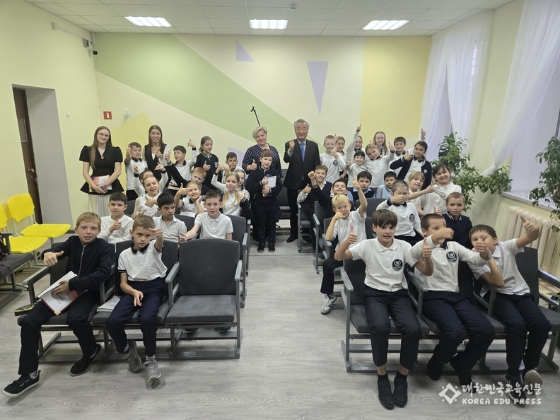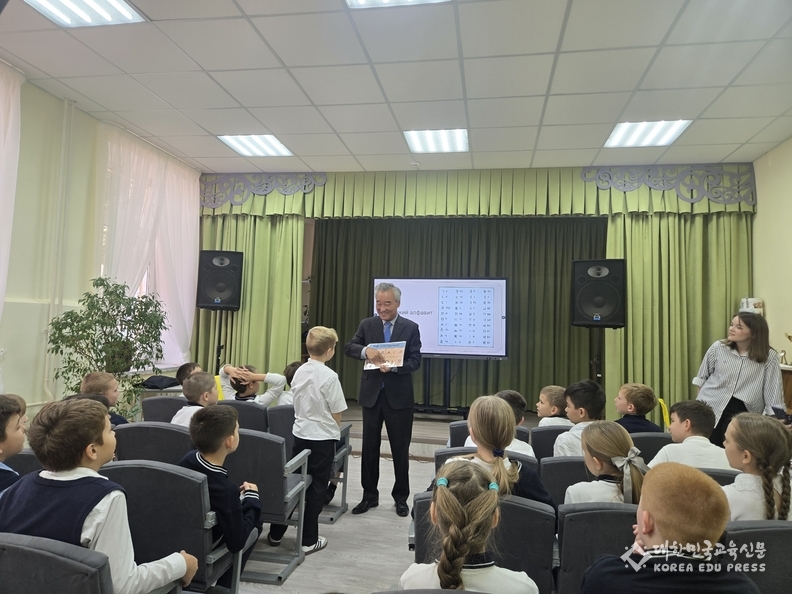 2025년10월3일(토) 11시 카잔 28김나지아(교장 스마기나 인네사) 2층 소강당에서 한국 소개 특강이 카잔연방대학교 고영철 교수 겸 한국학연구소장 주관으로, 4학년 학생과 교사를 총 52명을 대상으로 진행되었다.