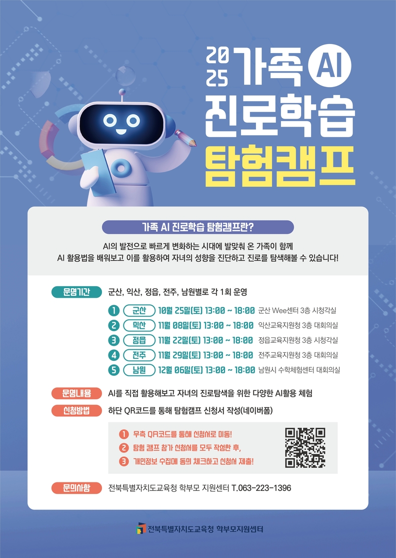 전북특별자치도교육청 학부모지원센터는 오는 25일부터 12월 6일까지 매주 토요일 전주·군산·익산·남원·정읍 등 5개 권역에서 ‘2025년 아이(AI)와 함께하는 캠프’를 운영한다고 20일 밝혔다.