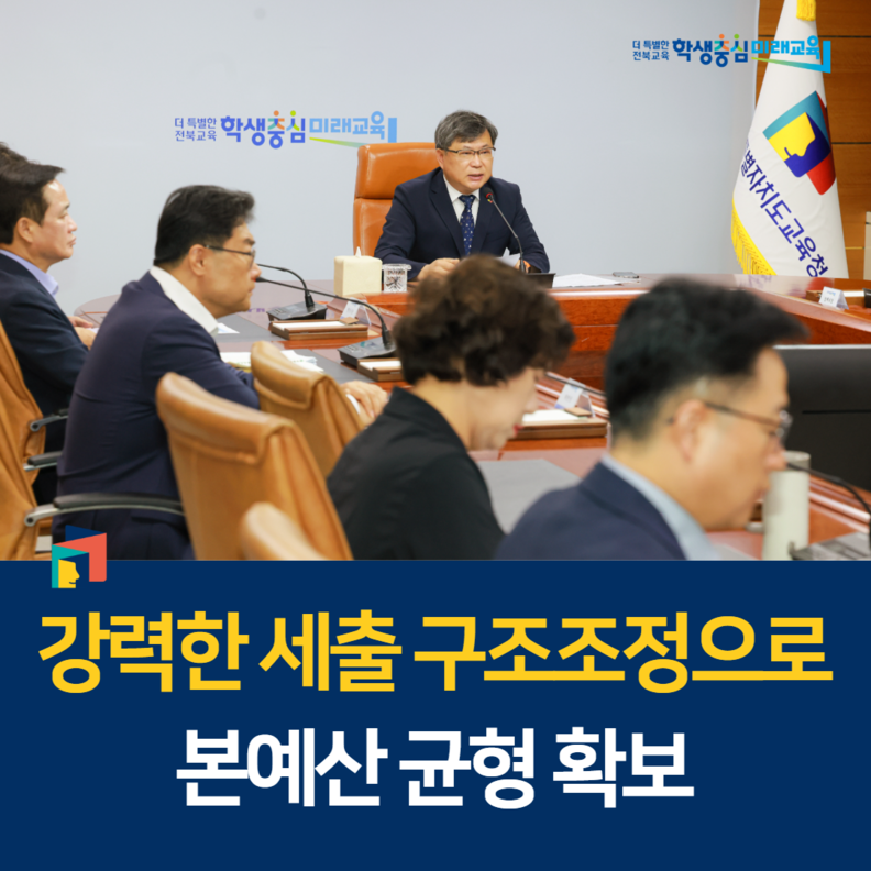 행사성 경비·연수비·소모성 경비 등 30% 이상 감액 및 자산취득 최소화, 신규사업 원칙적 금지 및 유사 중복사업 통폐합 등 사업규모 축소, 계속비 및 시설사업 재검토 등 전면적 지출 구조 개선 통해 본예산 편성의 기초를 마련했으며, 이를 바탕으로 2026년도 본예산을 ‘미래 교육 발전’과 ‘재정의 지속 가능성 확보’라는 두 트랙 전략으로 추진하고 있다.