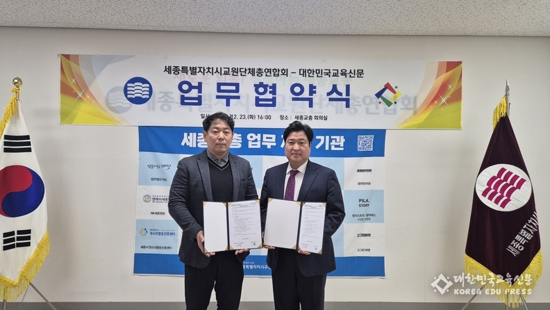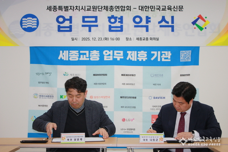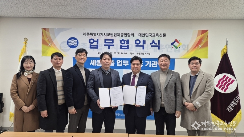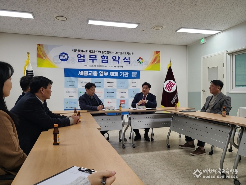 세종특별자치시교원단체총연합회(이하 세종교총)와 대한민국교육신문이 2025년 12월 23일(화) 오후 4시, 세종교총 사무국 회의실에서 업무제휴 협약을 체결했다. 이날 협약식에는 세종교총 남윤제 회장과 부회장단, 그리고 대한민국교육신문 대표 및 대전·세종지국이 참석해, 지역 교육현안을 ‘현장 중심’으로 풀어내기 위한 협력 체계를 구축하기로 뜻을 모았다.