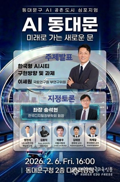 심포지엄은 ‘미래로 가는 새로운 문, AI 동대문’을 주제로 열린다. 주제 발표는 이세원 국토연구원 부연구위원이 ‘한국형 AI 시티 구현 방향 및 과제’를 발표하고, 지정토론은 송석현 한국디지털정부학회 회장이 좌장을 맡는다. 토론에는 양진석 LG AI연구원 책임연구원(2026년 AI 트렌드와 동대문구의 접목 방향), 김용덕 액서스코리아 대표(2025년 인공지능 인식 조사), 이동우 서울시립대 스마트시티학과장(미래 모빌리티), 김태경 경희대 빅데이터응용학과 교수(AI 기반 디지털 웰니스), 최재걸 한국외대 AI데이터융합학부 교수(동대문 로컬 LLM 구축) 등이 참여한다.