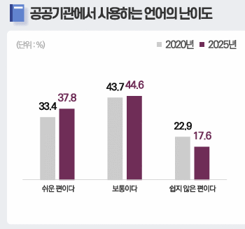 작년까지 이 칼럼을 통해서 누구나 쉽게 이해할 수 있는 언어생활을 해야 함을 강조한 바 있는데, ‘국민의 언어 의식 조사’ 결과로, 나의 그러한 강조점이 조금씩 실현돼 가고 있음을 수치로 확인할 수 있었다. 누구나 잘 이해할 수 있는 표기∙표현의 문제는 일차적으로는 공공언어 주체인 공공기관에 요구되는데, 아래 결과를 보면 공공기관 언어 난이도에서 ‘쉬운 편이다’는 올라가고, ‘쉽지 않은 편이다’는 내렸갔다. 이로써 공공기관에서 사용하는 언어가 국민들이 쉽게 이해할 수 있는 방향으로 가고 있음을 짐작할 수 있다. 물론 이는 국민들의 문해력이 향상된 결과일 수도 있지만, 아마 더 크고도 분명한 요인은 공공기관의 노력이라고 본다.
