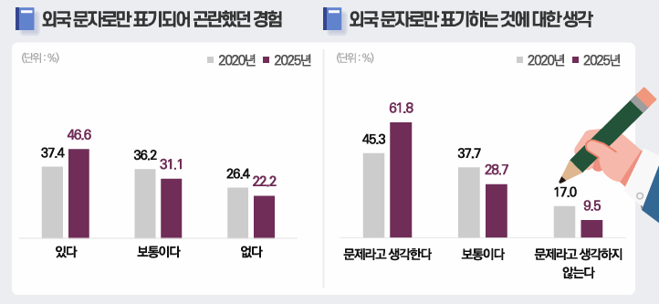왼쪽(외국 문자로만 표기되어 곤란했던 경험)과 오른쪽(외국 문자로만 표기하는 것에 대한 생각)은 상당한 인과관계가 있다고 보는데, 우리가 흔히 (나로서는 동의하기는 어렵지만) ‘있어 보인다’라고 생각하는 ‘외국 문자로만 표기하는 일’에 대해 국민들이 부정적인 경험을 한 비율이 높아졌음을 확인할 수 있다. 특히 외국 문자로만 표기하는 것에 대해 ‘문제’라고 생각하는 비율이 크게 높아진 점이 눈여겨볼 만하다.(상대적으로 ‘문제라고 생각하지 않는다’ 비율이 한 자리수로 떨어짐) 이는 우리 국민들의 언어 의식이 향상된 결과이자 공공언어 주체들이 언어 선택을 어떻게 해야 하는지도 시사해 준다.