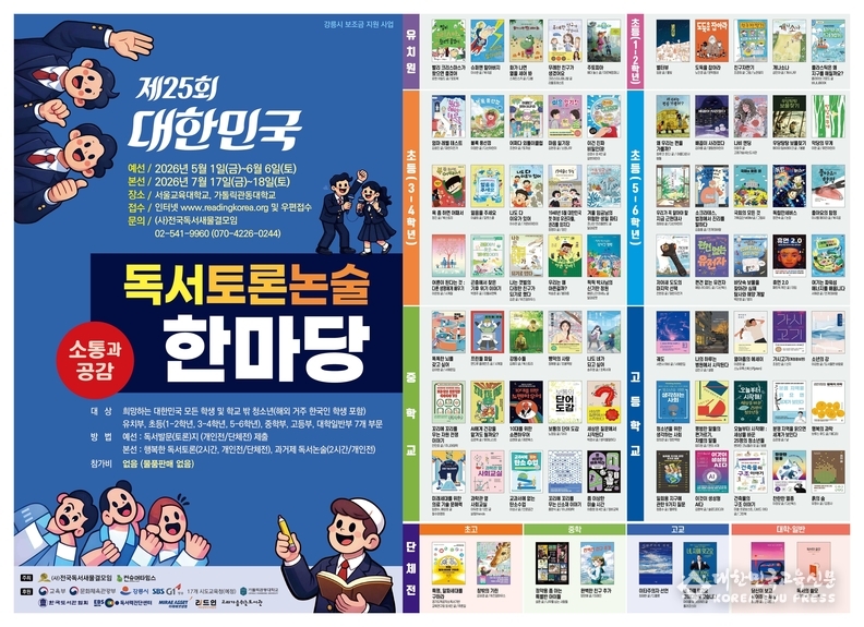 (사)전국독서새물결모임(이사장 임영규)은 소통과 공감의 가치가 절실한 시대적 요구에 부응하여, 2026학년도 학교 현장에서 활용할 ‘교실 독서토론 수업을 위한 좋은 도서’ 및 ‘제25회 대한민국 독서토론·논술한마당’ 선정 도서 목록을 공식 발표했다.