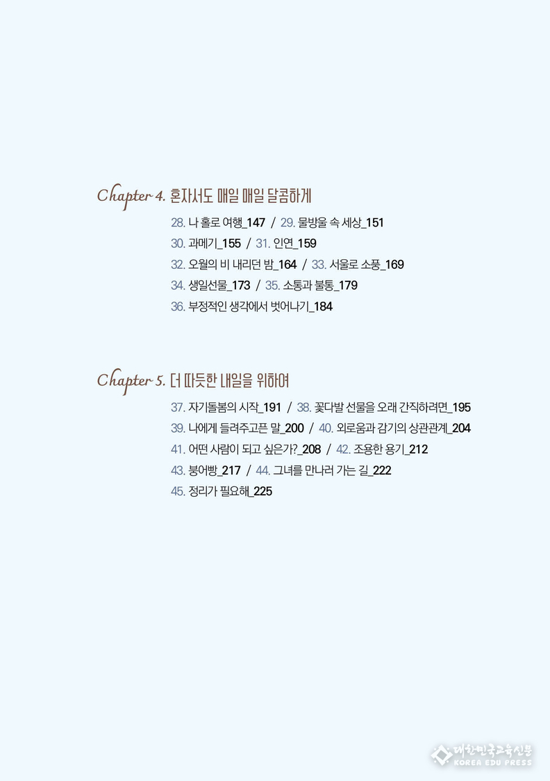 이 책은 인생의 쓴맛과 단맛이 조화롭게 어우러진 5개의 챕터로 구성되어 있다.